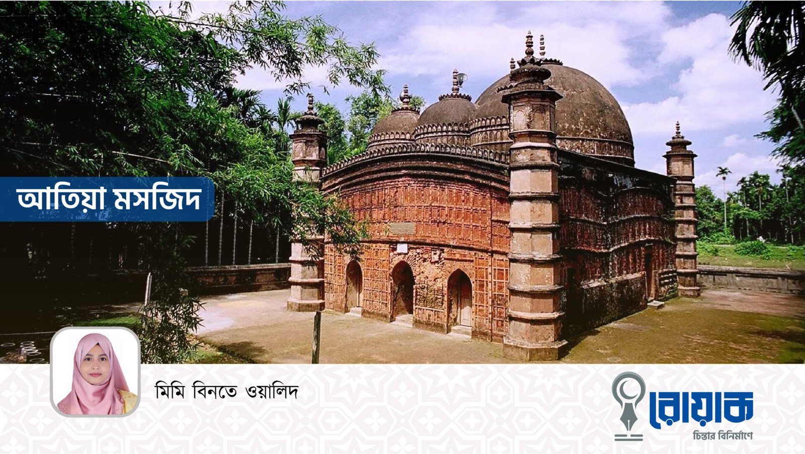 আতিয়া মসজিদের সবচেয়ে আকর্ষণীয় বৈশিষ্ট্য হচ্ছে এটি কুঁড়েঘরের কার্নিশের ন্যায় ধনুকের মতো বাঁকা আকৃতির কার্নিশ যা সম্পূর্ণভাবে বাংলার আঞ্চলিক বৈশিষ্ট্যকে ধারণ করে। এ ধরনের আকৃতির উৎপত্তিতে আদি অকৃত্রিম বাংলার ছনের কুটিরের বাঁকানো চালের প্রভাব স্পষ্ট । অলঙ্করণ বিশেষ করে টেরাকোটা নকশা ও খোদাই ইটের নকশায় বাংলার ওস্তাগর-শিল্পীরা সুস্পষ্ট অবদান রেখেছেন। বাংলার গ্রামের খড়ের তৈরী কুঁড়ে ঘরের বেড়ার খোপ নকশা আতিয়া মসজিদের ফাসাদ অলঙ্করণে স্থান করে নিয়েছে। বস্তুত বাঁশের চালাঘর থেকে ইটের নির্মাণে এ ধরনের উদ্ভাবন শিল্পমানে আকর্ষণীয় এবং নির্মাণ ক্ষেত্রে নতুন ধারা হিসেবে বিবেচিত।