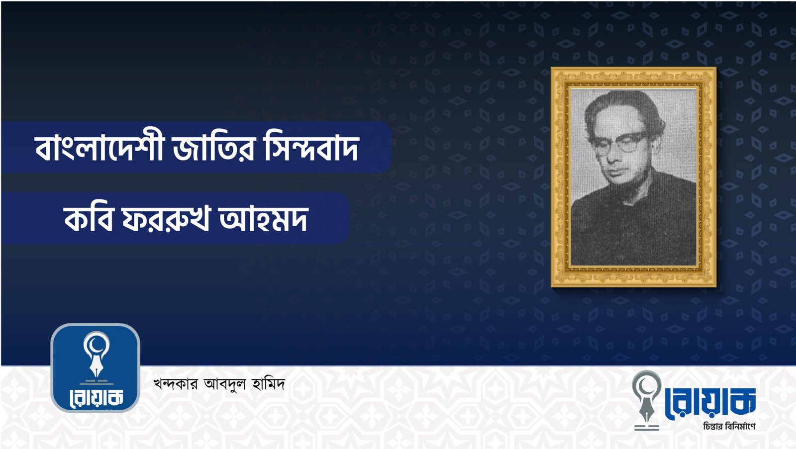 বাংলাদেশী জাতির সিন্দবাদ কবি ফররুখ আহমদ। আমাদের জাতীয় ঐতিহ্যের কবি ফররুখ আহমদ। আমাদের জাতীয় রেনেসাঁর কবি, সাত সাগরের মাঝি, সিরাজাম মুনীরার অমর কবি ফররুখ আহমদ। বিশিষ্ট সাংবাদিক-সাহিত্যিক মোহাম্মদ মাহফুজউল্লাহ লিখেছেন, সে সময়ে আমাদের সাহিত্যে ফররুখ আহমদকে কোণঠাসা করার, তাঁকে ‘ইসলামী রেনেসাঁ‘ আর ‘পাকিস্তানবাদের’ কবি বলে বাতিল করে দেবার অশুভ প্রচেষ্টা চলছিল। তাঁর কবিত্ব শক্তি, সৃজনী ক্ষমতা আর অনবদ্য সৃষ্টিকে বাদ দিয়ে আদর্শ আর মতবাদকে বড় করে তুলে তাঁকে খারিজ করে দেয়ার প্রচেষ্টারও অন্ত ছিল না। মোহাম্মদ মাহফুজউল্লাহ্ ‘সে সময় বলতে হয়ত বুঝিয়েছেন দু’এক দশক আগেকার কথা। কিন্তু কথাটা কোন একটা ক্ষুদ্র চক্র সম্পর্কে আজও কি সত্য কথা। মোহাম্মদ মাহফুজউল্লাহ সঙ্গে আমি সম্পূর্ণ একমত যে, ফররুখকে বাতিল ও খারিজ করে দেয়ার চেষ্টা করেছে একটি বিশেষ বিদগ্ধমহল উদ্দেশ্যমূলক ভাবেই। কোন কোন সম্প্রসারণবাদী ও আধিপত্যবাদী শক্তির সাংস্কৃতিক প্রভাব এদেশে বিস্তারে যারা মনে-প্রাণে আত্মনিয়োগ করেছিলেন বা করেছেন, তারাই ফররুখ আহমদকে প্রতিক্রিয়াশীল, সাম্প্রদায়িক, ইসলামপন্থী ও তমদ্দুনী কবি বলে খারিজ ও বাতিল করতে সবচেয়ে বেশী উৎসাহী। কারণ রেনেসাঁর কবি ফররুখ আহমদ তাঁদের পথের কাঁটা। সিরাজাম মুনীরার কবি ফররুখ আহমদ আল্লাহর হাবিব রসূলে মকবুল (সা:) কে লক্ষ করে লিখেছেন: ‘কে আসে, কে আসে সাড়া পড়ে যায় / কে আসে, কে আসে নতুন সাড়া জাগে সুপ্ত মৃত জনপদ, জাগো শতাব্দী ঘুমের পাড়া। হারা সম্বিত ফিরে দিতে বুকে/তুমি আনো প্রিয় আবেহায়াত/জানি সিরাজাম মুনীরা। তোমার রশ্মিতে জাগে কোটি প্রভাত। তবু বিদ্যুৎ কণা-স্ফুলিঙ্গে লুকানো রয়েছে লক্ষ দিন / তোমার আলোয় জাগে। সিদ্দিক, জিন্নুরাইন, আলী নবীন / ঘুম ভেঙে যায় আল-ফারুকের হেরি ও প্রভাত জ্যোতিষ্মান/মুক্ত উদার আলোকে তোমার অগণন শিখা পায় যে প্রাণ।